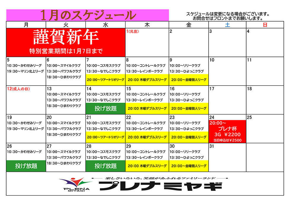| 1/24 | 土 | 20:00~ プレナ杯(前日まで\2200-、当日申込\2500-) |
